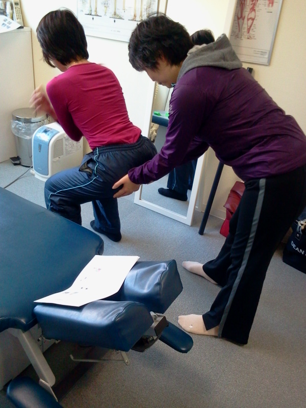 お尻を触っているのは、スクワットの練習です。