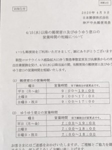 『神戸中央郵便局 ゆうゆう窓口』が新型コロナウイルスの緊急事態宣言及び、兵庫県からの外出自粛要請を受け、営業時間を変更していました。